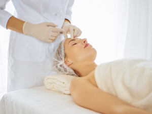 Beautiful woman receiving beauty injections with closed eyes. Beautician doctor hands doing beauty procedure to female face with syringe. Cosmetic medicine and surgery concept
